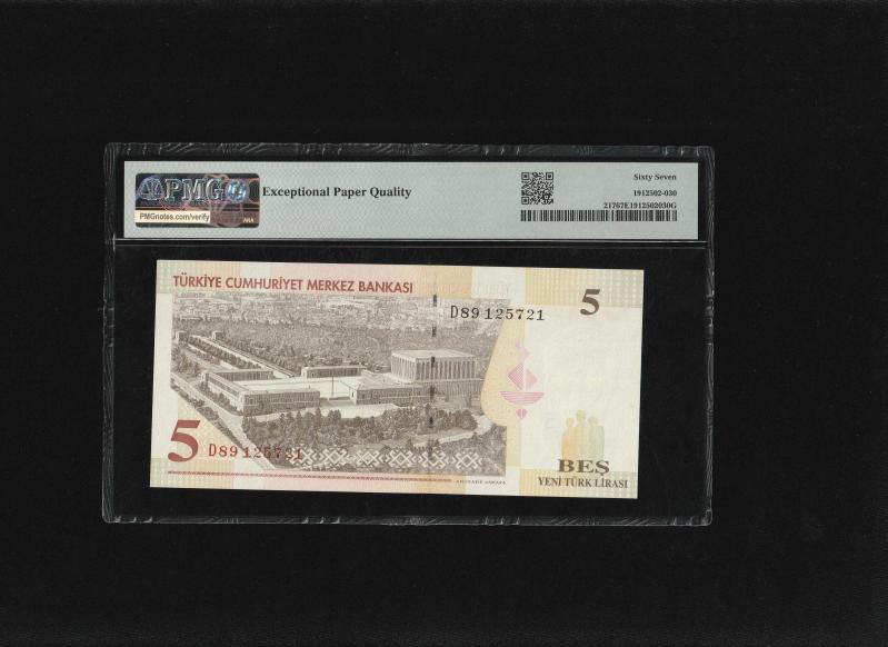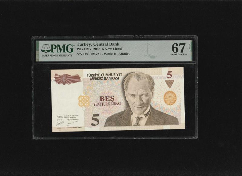 Beş Yeni Türk Lirası 5 YTL P217 2005 PMG 67 EPQ SUPERB GEM UNC S/N D89 125721 8. EMS 1. Tertip, 1 yıl önce satışa sunulmuştur.