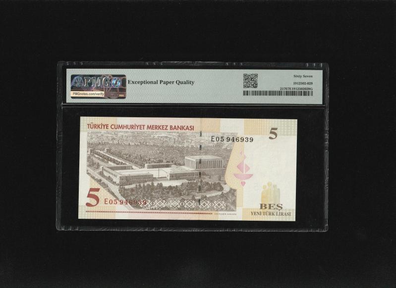 Beş Yeni Türk Lirası 5 YTL P217 2005 PMG 67 EPQ SUPERB GEM UNC S/N E05 946939 8. EMS 1. Tertip, 1 yıl önce satışa sunulmuştur.