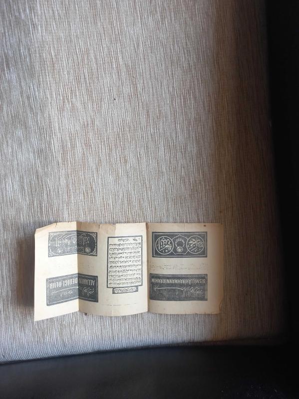 Besmele ve Kelime-i Tevhid: "BİSMİLLAHİRRAHMANİRRAHİM" yazısı En sağ panelde "ALLAHIN DEDİĞİ OLUR" ve "ER-RIZKU ALALLAH" (Rızık Allah'tandır) gibi teslimiyet ve tevekkül içeren ifadeler yer almaktadır. Dua Metinleri: Orta panelde, bereket veya korunma amacıyla taşınan Arapça dua metinleri (Karınca Duası gibi) . "Allah" ve "Muhammed" 10x20 cm başlıklı antika/koleksiyon objesi Türkiye menşe’lidir. 1920-1940 arası dönemine aittir.