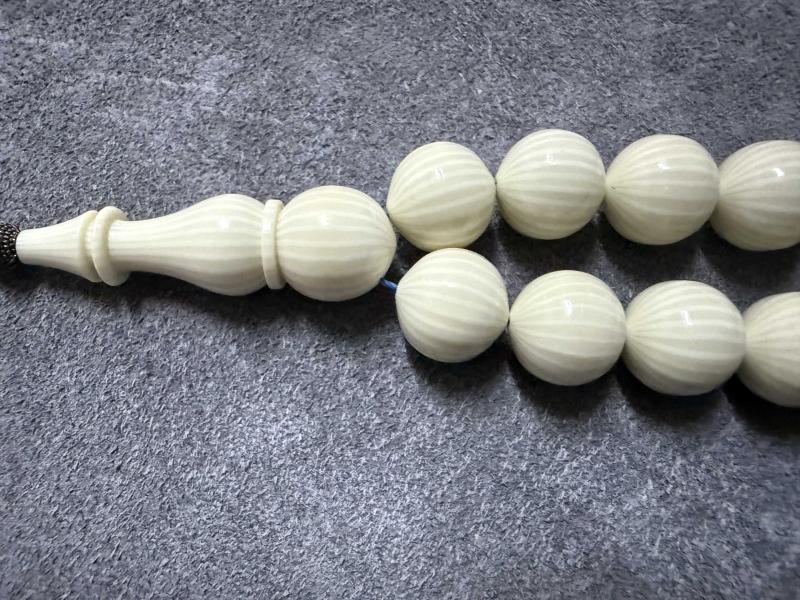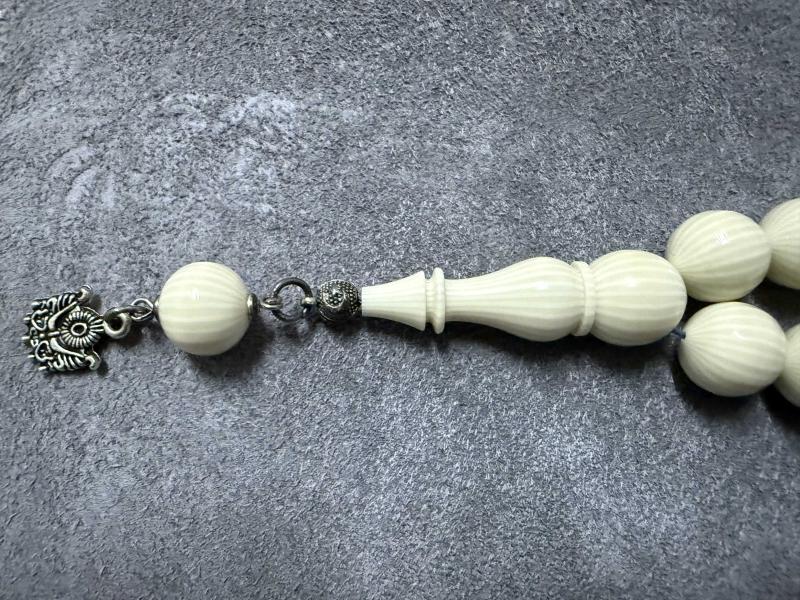 Beyaz Fransız kendinden çizgili galalith efe boy maskot tesbih. Tane boyu 13 mm. Metal aksam 925 ayar gümüştür. Ürün sıfırdır. Alıcıya şimdiden hayırlı olsun.