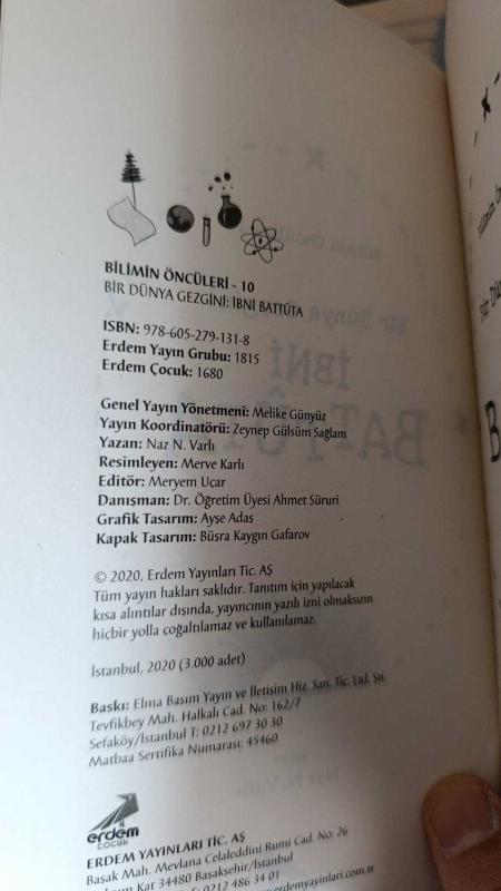 Bilimin Öncüleri, Bir Dünya Gezgini: İbni Battûta, Naz N.Varlı tarafından kaleme alınmıştır. Kitap 2020 yılında ERDEM ÇOCUK YAYINLARI tarafından [İstanbul] 9786052791318 ISBN kodu ile yayınlanmıştır. 112 sayfadır. Bilimin Öncüleri, Bir Dünya Gezgini: İbni Battûta adlı eser Türkçe dilindedir.