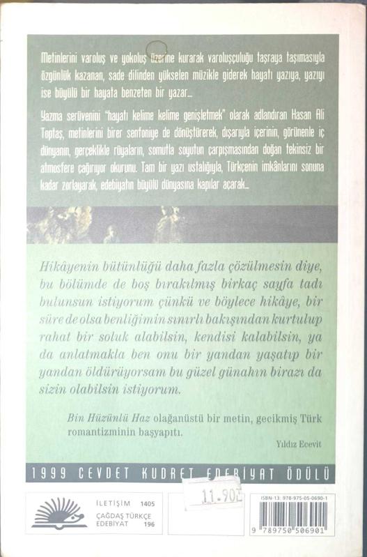 📘 Kitap Hakkında: “Bin Hüzünlü Haz”, Hasan Ali Toptaş’ın düşle gerçeği iç içe geçiren anlatımıyla, bellek, yolculuk ve kayboluş temalarını merkezine alan romanıdır. Metin, zamanın ve mekânın belirsizleştiği bir anlatı evreninde ilerler. 🗣️ Arka Kapak Metninden Hareketle: Bu roman, anlatının sınırlarını zorlayan diliyle okuru bir iç yolculuğa davet eder. Hatırlama ve unutma, varlık ve yokluk arasındaki ince çizgide dolaşan hikâye; şiirsel bir anlatım ve yoğun bir atmosferle kurulmuştur. “Bin Hüzünlü Haz”, okuru metnin içine çeken özgün bir edebiyat deneyimi sunmayı amaçlar. 👤 Kimler Okumalı: • Çağdaş Türk edebiyatına ilgi duyanlar • Şiirsel ve deneysel anlatıları sevenler • Hasan Ali Toptaş okurları