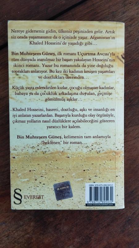 Bin Muhteşem Güneş, Khaled Hosseini tarafından kaleme alınmıştır. Kitap 2008 yılında EVEREST YAYINLARI tarafından yayınlanmıştır. Bu baskının çevirisi Püren Özgören tarafından yapılmıştır. 375 sayfadır. Bin Muhteşem Güneş adlı eser Türkçe dilindedir.