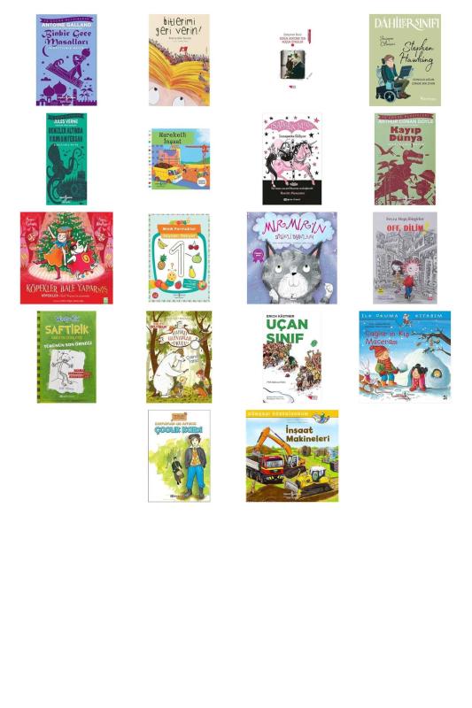 Binbir Gece Masalları: Kısaltılmış Metin - Bitlerimi Geri Verin! - Büyük Atatürk'ten Küçük Öyküler 1 - Dahiler Sınıfı - Stephen Hawking: Sonsuzluğun İzinde Bir Zihin - Denizler Altında Yirmi Bin Fersah: İş Çocuk Klasikleri Kısaltılmış Metin - Hareketli İnşaat - Isadora Moon - Lunaparka Gidiyor - Kayıp Dünya: İş Çocuk Klasikleri Kısaltılmış Metin - Köpekler Bale Yaparmış - Minik Parmaklar Sayıları Yazıyor: 3 - 4 Yaş - Mırmır'ın Sihirli Bıyıkları: Pedagog Onaylı - Off, Dilim! - Saftirik Greg'in Günlüğü 3. Kitap: Türünün Son Örneği - Sihirli Hayvanlar Okulu - Çalınan Tablo: Kolay Okuyorum - Uçan Sınıf: 1960 Andersen Ödülü - Çağlar’ın Kış Macerası: İlk Okuma Kitabım - Çocuk Kalbi - İnşaat Makineleri: Dünyayı Öğreniyorum