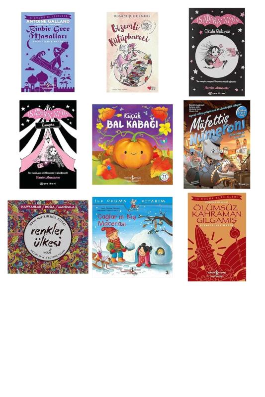 Binbir Gece Masalları: Kısaltılmış Metin - Gizemli Kütüphaneci - Isadora Moon - Okula Gidiyor - Isadora Moon Kampta - Küçük Bal Kabağı: Doğanın Eşsiz Hikayeleri 11 - Müfettiş Numeroni 1: Film Setinde Hırsızlık - Sayısal Zekâ Gelişimi için Etkinlikli ve Çıkartmalı Dedektiflik Çizgi Romanı (7-9 Yaş) - Renkler Ülkesi: Hayvanlar / Doğa / Mandala - Çağlar’ın Kış Macerası: İlk Okuma Kitabım - Ölümsüz Kahraman Gılgamış: Kısaltılmış Metin