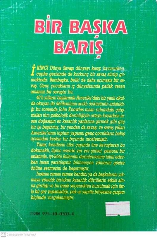Bir Başka Barış, John Knowles tarafından kaleme alınmıştır. Kitap İnkılap tarafından yayınlanmıştır. 224 sayfadır. Bir Başka Barış adlı eser Türkçe dilindedir.