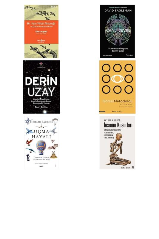 Bir Kum Yöresi Almanağı ve Oradan Buradan Eskizler: A Sand County Almanac and Sketches Here and There - Canlı Devre: Durmaksızın Değişen Beynin İçyüzü - Derin Uzay: Güneş Sistemi'nin Ötesine Evren'in Sınırlarına ve Zamanın Başlangıcına Bir Yolculuk: Güneş Sistemi'nin Ötesine Evren'in Sınırlarına ve Zamanın Başlangıcına Bir Yolculuk - Görsel Metodoloji - Uçma Hayali: Tasarım ve Evrimin Yerçekimini Alt Edişi - İnsanın Kusurları: İşe Yaramaz Kemiklerden Bozuk Genlere, Arızalarımıza Genel Bir Bakış