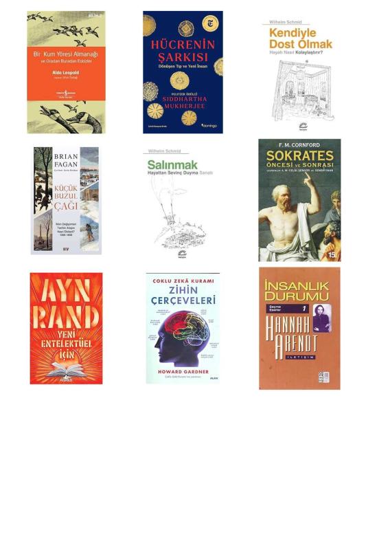 Bir Kum Yöresi Almanağı ve Oradan Buradan Eskizler: A Sand County Almanac and Sketches Here and There - Hücrenin Şarkısı - Dönüşen Tıp ve Yeni İnsan - Kendiyle Dost Olmak - Küçük Buzul Çağı: İklim Değişimleri Tarihin Akışını Nasıl Etkiledi? 1300-1850 - Salınmak: Hayattan Sevinç Duyma Sanatı - Sokrates Öncesi ve Sonrası - Yeni Entelektüel İçin - Zihin Çerçeveleri: Çoklu Zeka Kuramı - İnsanlık Durumu: Seçme Eserler 1