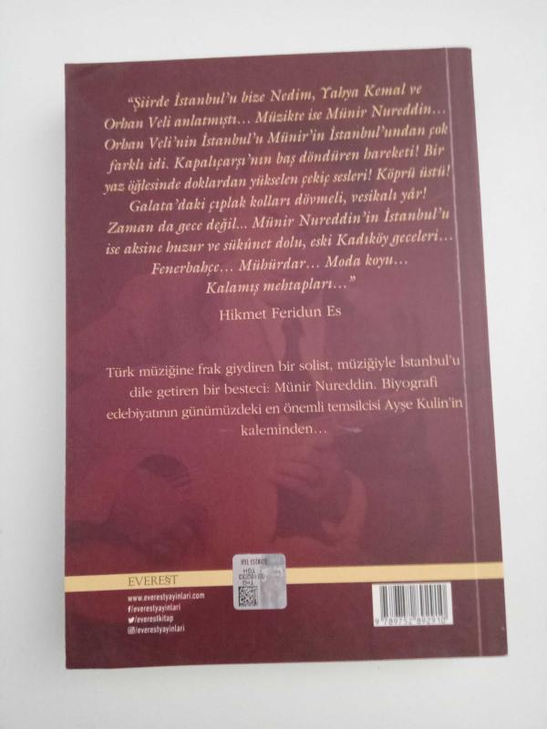 "Şiirde İstanbul’u Nedim, Yahya Kemal ve Orhan Veli anlatmıştı... Müzikte ise Münir Nureddin... Orhan Veli’nin İstanbul’u Münir’in İstanbul’undan çok farklı idi. Kapalıçarşı’nın baş döndüren hareketi! Bir yaz öğlesinde doklardan yükselen çekiç sesleri! Köprü üstü! Galata’daki çıplak kolları dövmeli, vesikalı yâr! Zaman da gece değil... Münir Nureddin’in İstanbul’u ise aksine huzur ve sükûnet dolu, eski Kadıköy geceleri... Fenerbahçe... Mühürdar... Moda koyu... Kalamış mehtapları..." Hikmet Feridun Es Türk müziğinde frak giydiren bir solist, müziğiyle İstanbul’un dile getiren bir besteci: Münir Nureddin. Biyografi edebiyatının günümüzdeki en önemli temsilcisi Ayşe Kulin’in kaleminden...