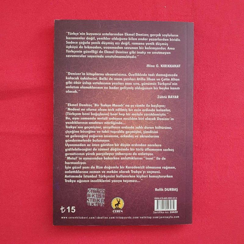 Ekmel Denizer,Bir Trakya Masalına şu cümle ile başlıyor; Nedeni ne olursa olsun terk edilmiş bir evin ardında kalanlar, (Türkçem beni bağışlasın) beni hep bir melale sürüklemiştir. Bu, aynı zamanda melali anlayan nesilden biri olarak Denizerin yazdıklarının anahtarı niteliğinde... Trakydnın geçmişine, yüzyılların ardında saklı duran kültürüne, çiçeğine böceğine ve tabii toprakla geçmişini, şimdisini ve geleceğini yoğuran insanına, arkadaş ve akranlarına göndermelerde bulunuyor. Uyanmadan az önce görülen bir düşün ardından nerelere gidilebileceğini de sünnet düğününde bir türlü üflemeyen sarhoş gırnatıcının yürek parçalayıcı yakarışını da anlatıyor. Melarin aynasından bakarken anlattıkların. ironi ile de harmanlıyor. İşin güzel yanı da Rize doğumlu bir Karadenizli olmasına rağmen, anlattıklarına zaman ve mekan olarak Trakyayı seçmesi. Antımında İstanbul Türkçesini kullanırken kişileri konuştururken Trakya ağzının inceliklerini yazıya taşıması...
