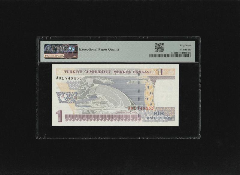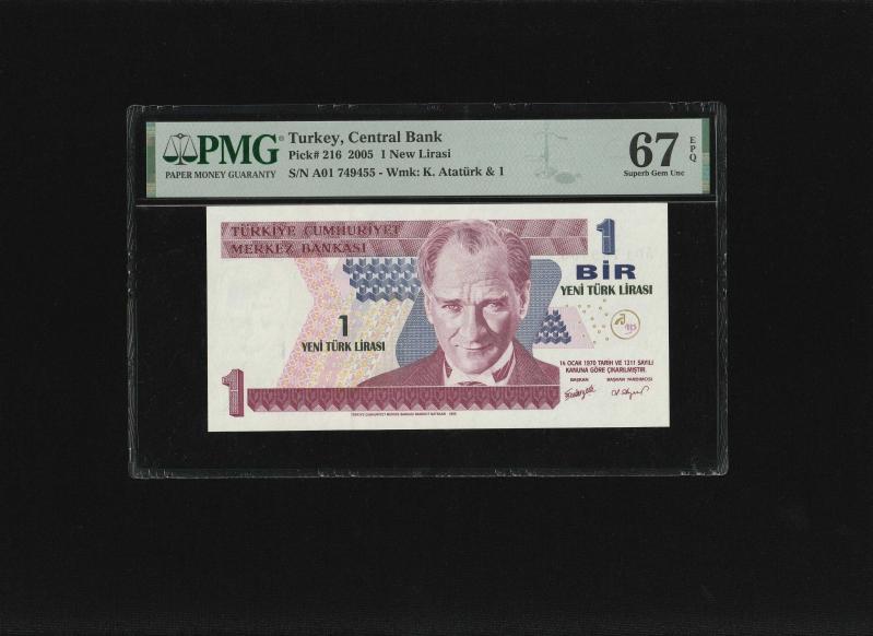 Bir Yeni Türk Lirası 1 YTL P216 2005 PMG 67 EPQ SUPERB GEM UNC S/N A01 749455 8. EMS 1. Tertip, 1 yıl önce satışa sunulmuştur.