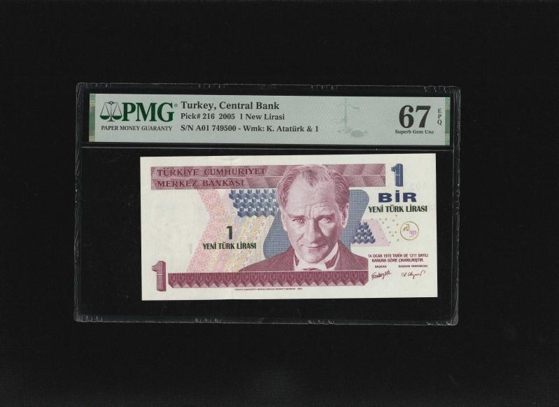 Bir Yeni Türk Lirası 1 YTL P216 2005 PMG 67 EPQ SUPERB GEM UNC S/N A01 749500 8. EMS 1. Tertip, 1 yıl önce satışa sunulmuştur.