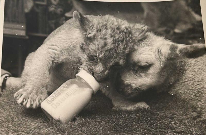 Bir biberondan beraber süt içerken çekilmiş olan yavru aslan-koyun fotoğrafı. Nisan 1974 .ORJİNAL SİYAH & BEYAZ 21x18cm EBADINDA - 1940'LAR, 1950'LER, 1960'LAR ve 1970'LER, 5 ay önce satışa sunulmuştur.