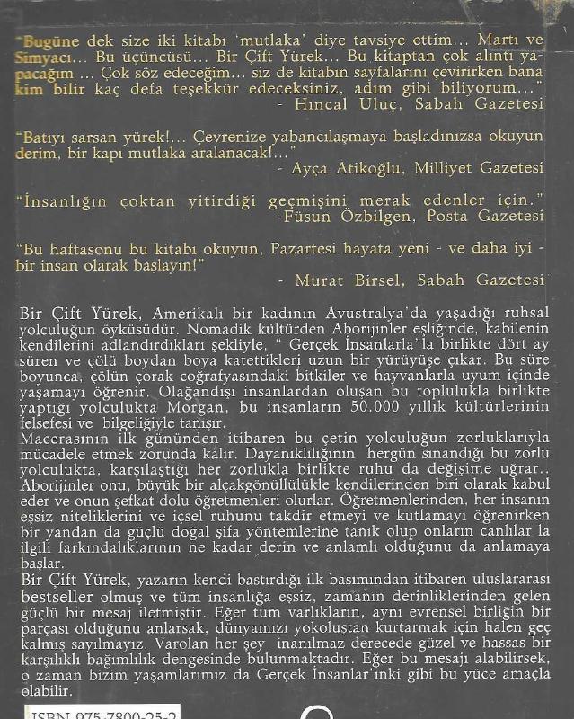 Bir çift yürek, Malro Morgan tarafından kaleme alınmıştır. Kitap 2000 yılında Drahma Yayınları tarafından [İstanbul] 975-7800-25-2 ISBN kodu ile yayınlanmıştır. Bu baskının çevirisi Eren Cendey tarafından yapılmıştır. 225 sayfadır. Bir çift yürek adlı eser Türkçe dilindedir.