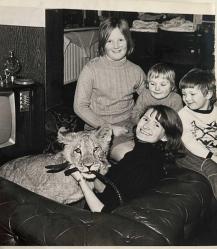 Bir evde koltukta oturan yavru aslan ile poz veren yetişkin kadın ve küçük çocukların olduğu bir fotoğraf.ORJİNAL SİYAH & BEYAZ 14x11cm EBADINDA - 1940'LAR, 1950'LER, 1960'LAR ve 1970'LER