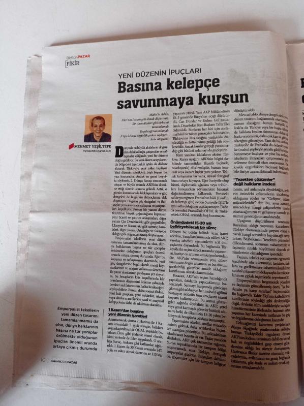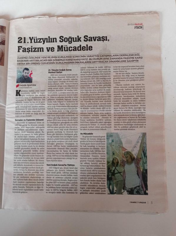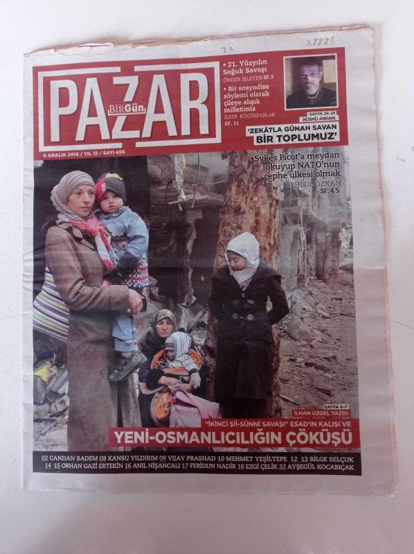 Birgün Pazar Gazetesi - 6 Aralık 2015 - Sayı 456 - İkinci Şii Sünni Savaşı Esad'ın Kalışı Yeni Osmancılığın Çöküşü - Sykes Picot'a Meydan Okuyup NATO'nun Cephe Ülkesi Olmak - Hüsnü Arkan - Bir Sosyodise Söylemi Olarak Çileye Alışık Milletiz adlı eser Türkçe dilindedir.