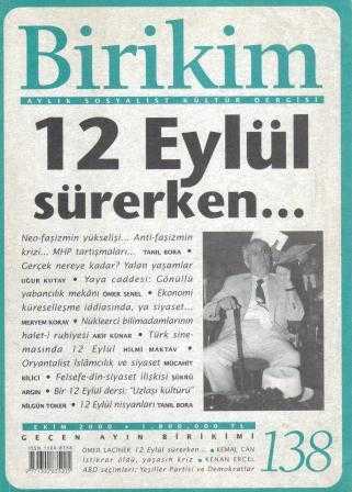 Birikim Aylık Sosyalist Kültür Dergisi Yıl: Ekim 2000 Sayı: 138 "12 Eylül Sürerken…, Kolektif tarafından kaleme alınmıştır. Kitap 2000 yılında Birikim tarafından [İstanbul] yayınlanmıştır. Satışta olan kitap, yayınevinin 1. baskısıdır. 112 sayfadır. Sayfa bilgisi Enzo olarak belirtilmiştir. Birikim Aylık Sosyalist Kültür Dergisi Yıl: Ekim 2000 Sayı: 138 "12 Eylül Sürerken… adlı eser Türkçe dilindedir.