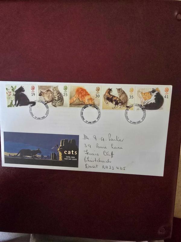 Tema: Kediler (Cats). İçerik: Zarf üzerinde 5 farklı pul bulunmaktadır. Bu pullar o dönemdeki yaygın kedi türlerini (Siyam, Tekir, Sarman vb.) temsil eder. Pulların Değerleri: 19p, 25p, 30p, 35p ve 41p. Damga: "First Day of Issue - Bournemouth & Poole" damgasıyla, pulların çıktığı ilk gün olan 17 Ocak 1995 tarihinde mühürlenmiştir. Adres Detayı: Zarf el yazısıyla adreslenmiştir. Bu tür zarflar, adreslenmemiş (unaddressed) olanlara göre koleksiyon değerinde çok küçük bir fark yaratabilir ancak görseldeki gibi temiz bir yazı genellikle kabul görür.