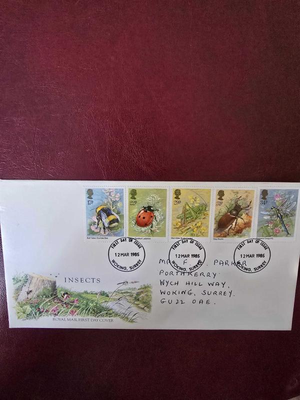 Basım Tarihi: 12 Mart 1985. Konu: Britanya'nın yerel böcek türleri. Pullar: Set 5 adet puldan oluşmaktadır: 17p: Dağ Bombus Arısı (Bombus terrestris) 22p: Yedi Noktalı Uğur Böceği (Coccinella septempunctata) 29p: Yeşil Çekirge (Decticus verrucivorus) 31p: Geyik Böceği (Lucanus cervus) 34p: İmparator Yusufçuk (Anax imperator) Damga (Cancellation): Zarfın üzerinde "First Day of Issue - Woking, Surrey" damgası bulunmaktadır. Bu, pulların tedavüle çıktığı ilk gün Woking şehrinde mühürlendiğini gösterir.