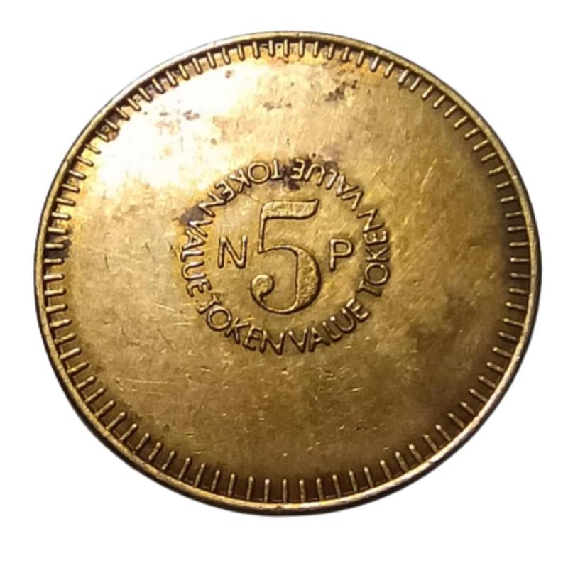 Birleşik Krallık 5 Yeni Pence Otomat Jetonu Pirinç Ağırlık (gram) 4,83 gr Çap (mm) 23 mm Kalınlık 1,5 mm