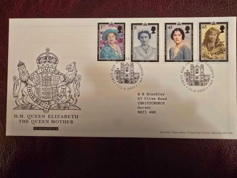 Tema: Ana Kraliçe Elizabeth'in vefatı anısına (1900–2002). İçerik: Üzerinde 4 adet anma pulu bulunmaktadır. Bu pullar aslında 1990 yılındaki 90. yaş günü tasarımlarıyla aynıdır ancak vefat anısına siyah bir yas çerçevesiyle ve güncel fiyatlarla (1st, E, 45p ve 65p) yeniden basılmıştır. Damga: "London SW1" posta koduyla, 25-4-2002 tarihli özel bir "First Day of Issue" (İlk Gün Basımı) mühürlemesine sahiptir.