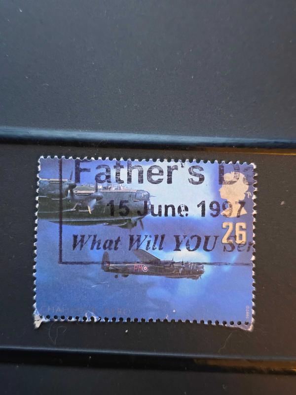 Emisyon Yılı: 1997 Seri Adı: "Architects of the Air" (Havanın Mimarları) Betimlenen Uçak: Bu pul, efsanevi İngiliz ağır bombardıman uçağı olan Avro Lancaster'ı temsil etmektedir. Posta Değeri: 26 Pence (26p). Tasarım: Bu seri, İngiliz havacılık tarihindeki önemli uçak tasarımcılarını ve onların ikonik uçaklarını onurlandırmak için 10 Haziran 1997'de piyasaya sürülmüştür. Damga ve Özel Durum Görseldeki pulun üzerinde "Father's Day - 15 June 1997" ibaresini içeren özel bir hatıra damgası (postmark) bulunmaktadır. Bu, pulun o dönemdeki Babalar Günü vesilesiyle postadan geçtiğini veya özel bir filateli etkinliğinde damgalandığını gösterir.