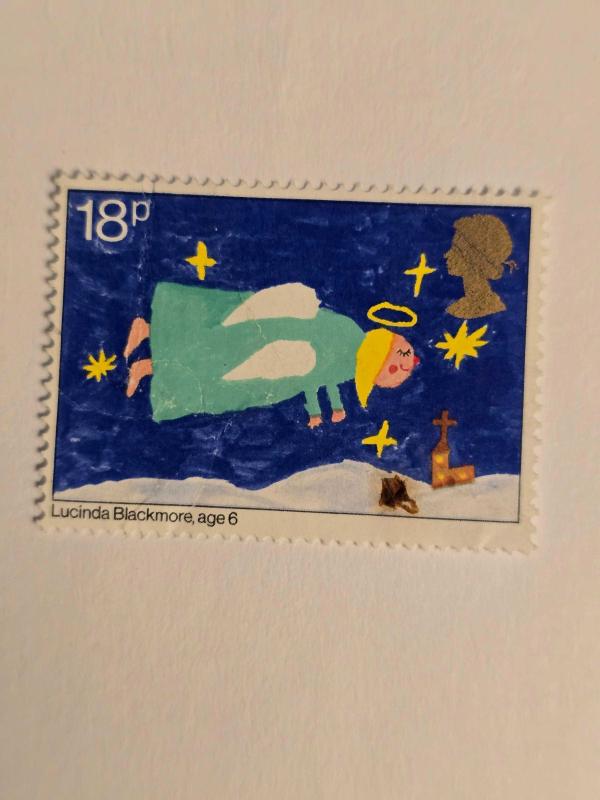 Emisyon (Yayın) Tarihi: 18 Kasım 1981 (Görselde 1992 gibi algılanmış olabilir ancak bu seri 1981 Noel dönemine aittir). Tema: Noel (Christmas 1981). Tasarımcı: Lucinda Blackmore (O dönemde 6 yaşındaydı). Konsept: Royal Mail, o yıl Noel pulları için çocuklar arasında bir tasarım yarışması düzenlemişti. Bu pul, "Uçan Melek" (Flying Angel) tasarımıyla yarışmayı kazanan çocuklardan biri olan 6 yaşındaki Lucinda Blackmore'un eseridir. Üzerindeki Detaylar: Sağ üstte Kraliçe II. Elizabeth'in silüeti, sol üstte 18p (18 Pence) değerindeki nominal tutar yer almaktadır.