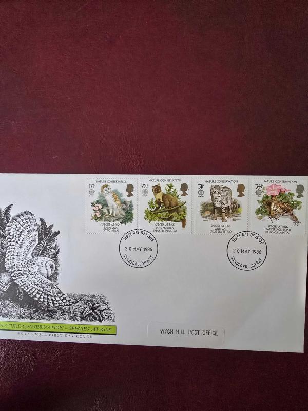 Yayın Tarihi: 20 Mayıs 1986. Tema: Doğayı koruma bilincini artırmak amacıyla Avrupa (Europa) serisi kapsamında basılmıştır. Pullar: Zarfın üzerinde Patrick Oxenham tarafından tasarlanan dört farklı tür yer almaktadır: 17p: Peçeli Baykuş (Barn Owl) 22p: Ağaç Sansarı (Pine Marten) 31p: Yaban Kedisi (Wild Cat) 34p: Çizgili Kurbağa (Natterjack Toad) Damga: Zarf, Guildford, Surrey damgasıyla mühürlenmiştir.