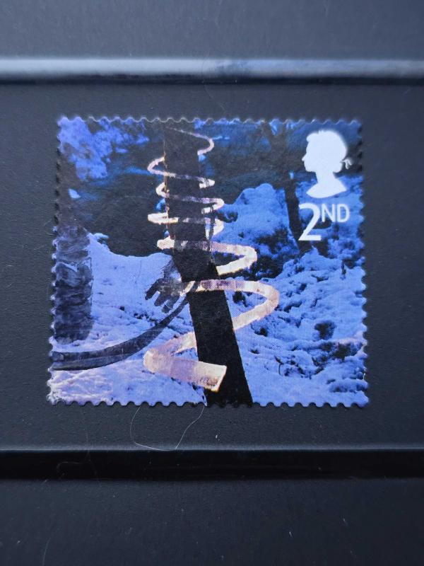 Tema: "Işıklı Buz Sarmalı" (Ice Spiral). Bu tasarım, ünlü sanatçı Andy Goldsworthy'nin buzdan yaptığı heykelleri konu alan özel bir serinin parçasıdır. Görselde karla kaplı bir zeminde, bir ağaç gövdesine sarılmış parlayan bir buz sarmalı tasvir edilmiştir. Karakter: Sağ üst köşede, pulun basıldığı dönemin hükümdarı olan Kraliçe II. Elizabeth'in silüeti yer almaktadır. Sınıf: Üzerinde "2ND" ibaresi bulunur, bu da "2nd Class" (2. Sınıf) gönderiler için kullanıldığını gösterir. 2. Emisyon (Basım) Yılı Bu pul, 2003 yılı Noel (Christmas) serisi kapsamında 4 Kasım 2003 tarihinde tedavüle çıkarılmıştır.