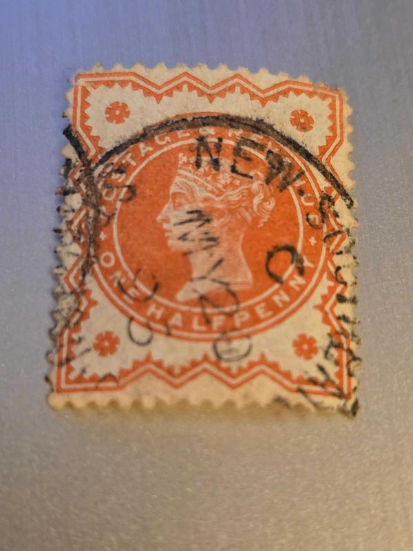 Hükümdar: Kraliçe Victoria. Seri: "Jubilee Issue" (Jübile Serisi) olarak bilinir. Emisyon Yılı: Bu pul ilk olarak 1 Ocak 1887 tarihinde Kraliçe Victoria'nın tahtta 50. yılını (Altın Jübile) kutlamak amacıyla basılmıştır. Değer ve Renk: Pulun üzerinde "POSTAGE & REVENUE" (Posta ve Gelir/Vergi) ibaresi ile "ONE HALFPENNY" (Yarım peni) değeri yer alır. Rengi turuncu (bazı kataloglarda "orange-vermilion" olarak geçer). Fiziksel Özellikler Baskı Yöntemi: Yüzey baskı (surface printed) tekniğiyle üretilmiştir. Damga: Pul üzerinde siyah bir mühür (iptal damgası) bulunmaktadır. Bu damgalar genellikle pulun hangi postaneden ve hangi tarihte geçtiğini gösterir; üzerindeki "NEW..." ibaresi muhtemelen İngiltere'deki bir şehir isminin (örneğin Newcastle veya Newton) başlangıcıdır.