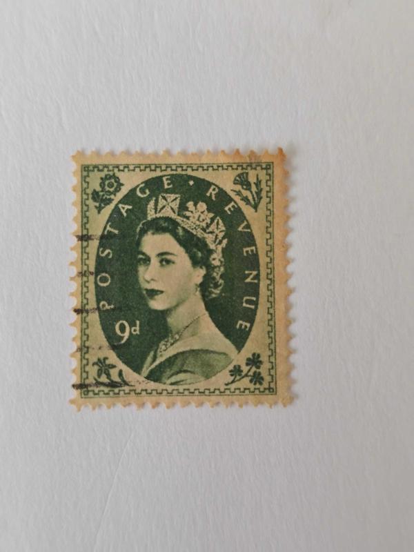 Birleşik Krallık filateli tarihinin en ikonik serilerinden biri olan "Wilding" serisine ait bir posta puludur. Bu seri, adını Kraliçe II. Elizabeth'in portresini çeken fotoğrafçı Dorothy Wilding'den almıştır. Hükümdar: Kraliçe II. Elizabeth. Nominal Değeri: 9d (9 Pre-decimal Pence - 1971 öncesi eski İngiliz kuruşu). Renk: Bronz-Yeşil (Bronze Green). Tasarım: Dorothy Wilding'in 1952 yılında çektiği portre temel alınmıştır. Köşelerdeki semboller Birleşik Krallık'ı temsil eder (Gül, Devedikeni, Nergis ve Yonca). Kullanım Alanı: Hem posta ("Postage") hem de mali/gelir vergisi ("Revenue") işlemlerinde kullanılabileceğini belirten ibare taşır. Emisyon (Basım) Yılı Bu özel 9d yeşil varyantı birkaç farklı tarihte basılmıştır; ancak en yaygın olanları şunlardır: İlk Basım: 1954 (Filigran: "Tudor Crown"). İkinci Basım: 1955-1958 (Filigran: "St. Edward's Crown"). Sonraki Basımlar: 1962-1967 (Fosforlu bantlı veya farklı filigranlı versiyonlar). Fotoğraftaki pulun tam yılını belirlemek için arka yüzündeki filigrana (kağıt içindeki desen) bakmak gerekir, ancak genel olarak 1950'lerin sonu veya 1960'ların başı dönemine aittir.