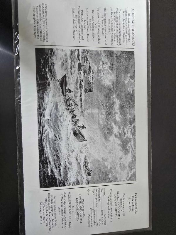 Bu ürün teknik olarak bir FDC (İlk Gün Zarfı) değil, pulların tertemiz (mint) ve özel tasarım bir dosya içinde sunulduğu koleksiyonluk bir settir. Paket Numarası: 162 İçerik: Dosya içinde 4 adet damgasız (mint) pul bulunmaktadır: 17p: Can kurtarma filikası (Lifeboat) 22p: Deniz feneri (Lighthouse) 31p: Uydu iletişimi (Satellite) 34p: Şamandıralar (Buoys) Tasarım: Dosya metinleri Suzanne Wolstenholme tarafından yazılmış, grafikler Newell and Sorrell Design Limited tarafından yapılmıştır.