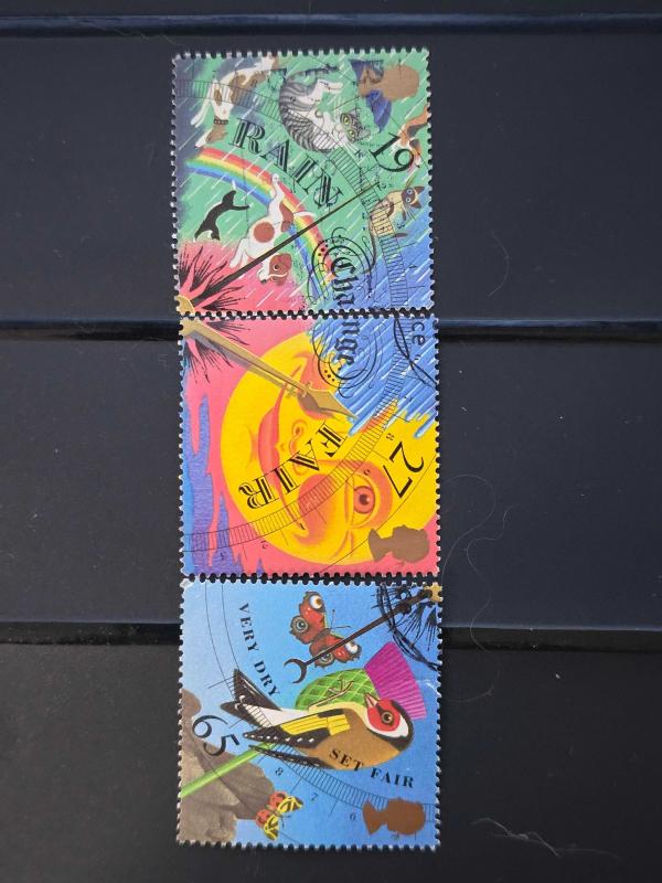 Seri Adı: "The Weather" (Hava Durumu) Emisyon Yılı: 13 Mart 2001 Çıkarılma Nedeni: İlk hava durumu haritalarının halka satışının 150. yıl dönümünü kutlamak amacıyla basılmıştır. Tasarım: Howard Brown tarafından tasarlanmış, illüstrasyonları Tony Meeuwissen tarafından yapılmıştır. Teknolojik Özelliği: Bu serinin en büyüleyici özelliği, termokromik (ısıya duyarlı) olmasıdır. Örneğin, 19p değerindeki pulun üzerindeki bulutlar, parmağınızla dokunup ısıttığınızda renk değiştirerek altındaki mavi gökyüzünü veya güneşi ortaya çıkarır. Bu, pullarda bu teknolojinin dünyadaki ilk kullanımlarından biridir. 2. Pulların İçeriği Seri dört farklı hava durumunu ve bunlarla özdeşleşmiş deyimleri/simgeleri işler: 19p: "Rain" (Yağmur) – İngilizcedeki "it's raining cats and dogs" (kedi köpek yağıyor) deyimine atıfta bulunur. 27p: "Fair" (Açık/Güneşli) – Gülen bir güneş figürüyle açık havayı simgeler. 65p: "Set Fair" (Sabit Açık) – Kuş ve kelebek figürleriyle sakin ve kuru havayı tasvir eder.