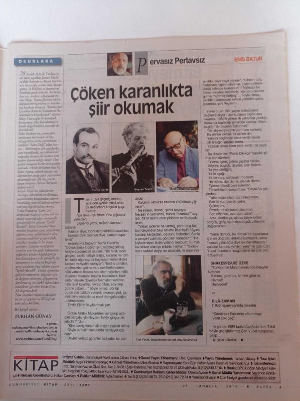 Bitmeyecek Bir Sözlüğün Sayfaları Arasında - İpekli Mendil - Tevfik Fikret - Neyzen Tevfik - Fazıl Hüsnü Dağlarca - Can Yücel - Müge Tuzcuoğlu - Roboski - Fakir Baykurt - Sabır Dağı - Cumhuriyet Kitap adlı eser, Kitap > Süreli Yayınlar > Gazeteler kategorisinde İkinci El olarak satıştadır.