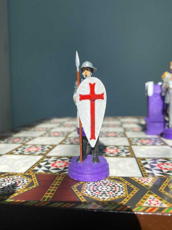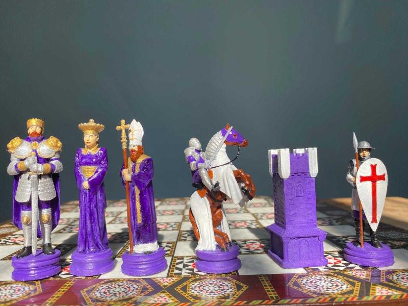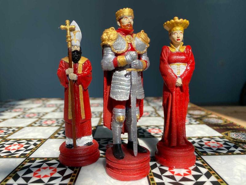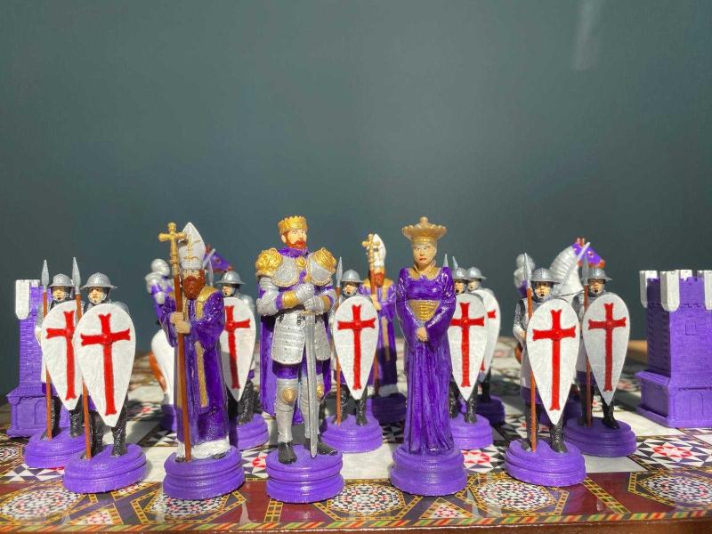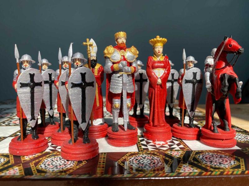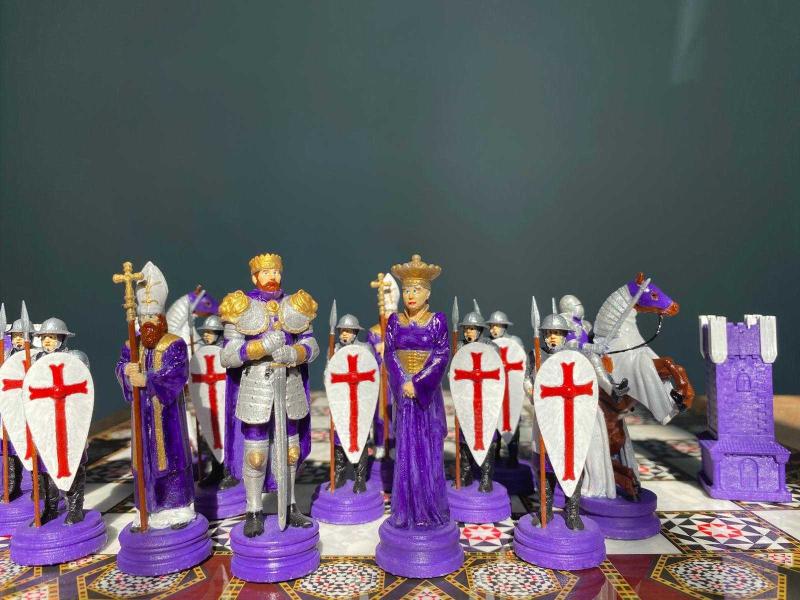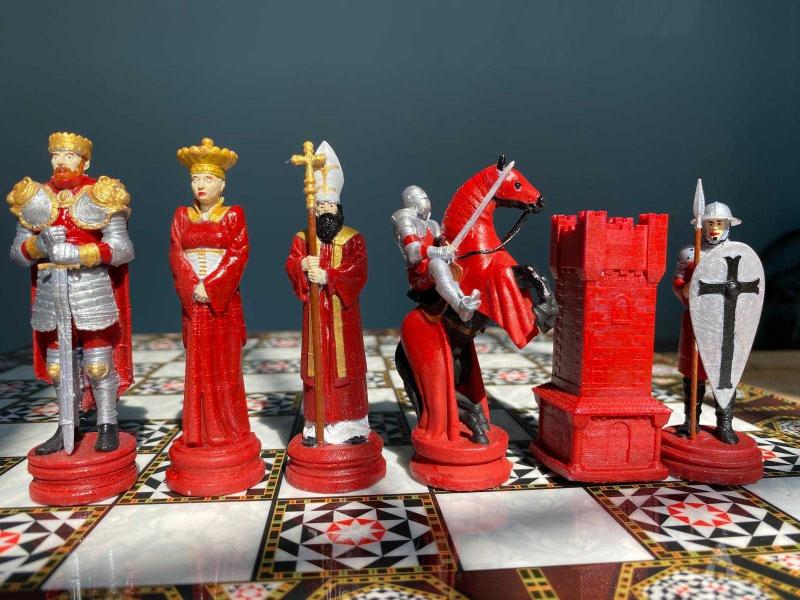 Bu özel tasarım satranç takımı, Bizans İmparatorluğu döneminin tarihi figürlerinden ilham alınarak üretilmiştir. İmparator , kraliçe , kale askeri, suvari şövalye ve papaz setin taşlarını oluşturmaktadır. 🔹 Taşlar: Polimer malzeme – elde boyanmış – yüksek detaylı 🔹 Taş yüksekliği: 8 cm 🔹 Tahta: Masif ahşap – 37x37 cm ölçülerinde 🔹 Toplam ağırlık: 2 kg 🔹 Renk:Kırmızı/Mor 🔹 Kutusunda gönderilir ✔️ Oyuncular için dengeli ağırlık ✔️ Dekoratif olarak vitrin, ofis ya da kütüphane için ideal ✔️ Özel günlerde hediye olarak tercih edilebilir (Babalar Günü, terfi hediyesi, koleksiyonluk vb.) ❗ Sadece sınırlı sayıda üretildi. Stoklar tükenmeden sahip olun.