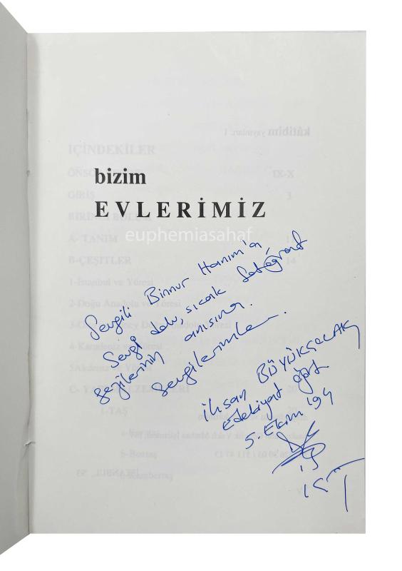 Özgün karton kapağında, çok temiz durumda, 19.5 x 13 cm, [x], 171 sayfa, s/b ve renkli resimli. "Bizim evlerimiz. Yazarı İhsan Büyükçolak'tan ithafen -İMZALI-, R. KIRIKÇI - İHSAN BÜYÜKÇOLAK, Kâtibim Yayınları, İstanbul, 1993" -- Sanat Mimari Türk evi Geleneksel mimarlık.
