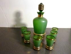 Bohem yeşil renkli likör takımı. 1 likör şişesi ve 6 likör kadehi. Şişe ve kadehlerin alt kısımları boğumlu ve altın vermeyli. 19. Y.y. Kondisyonu süper. Şişe Y :21cm. Kadeh Y:6 cm.