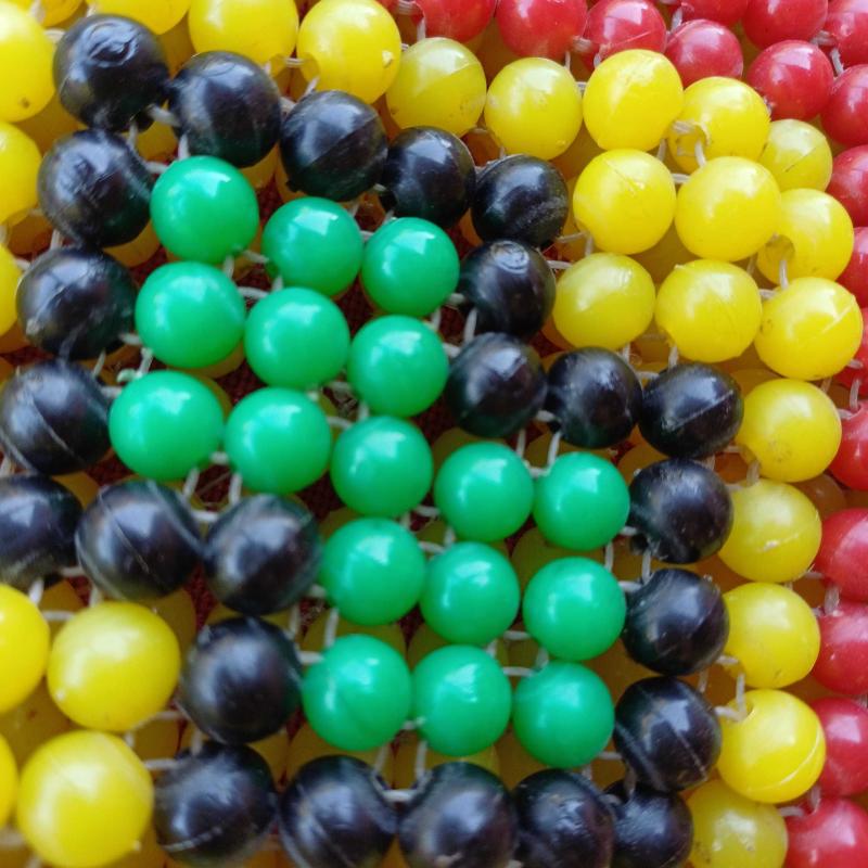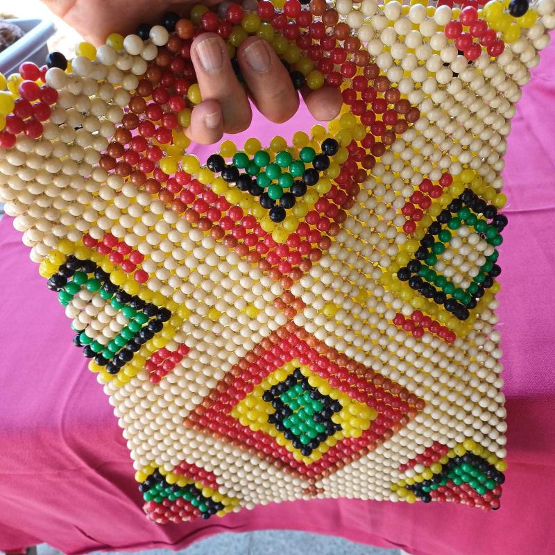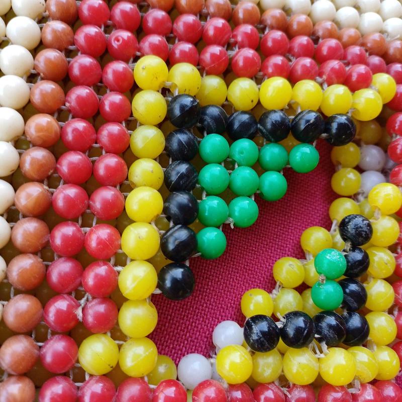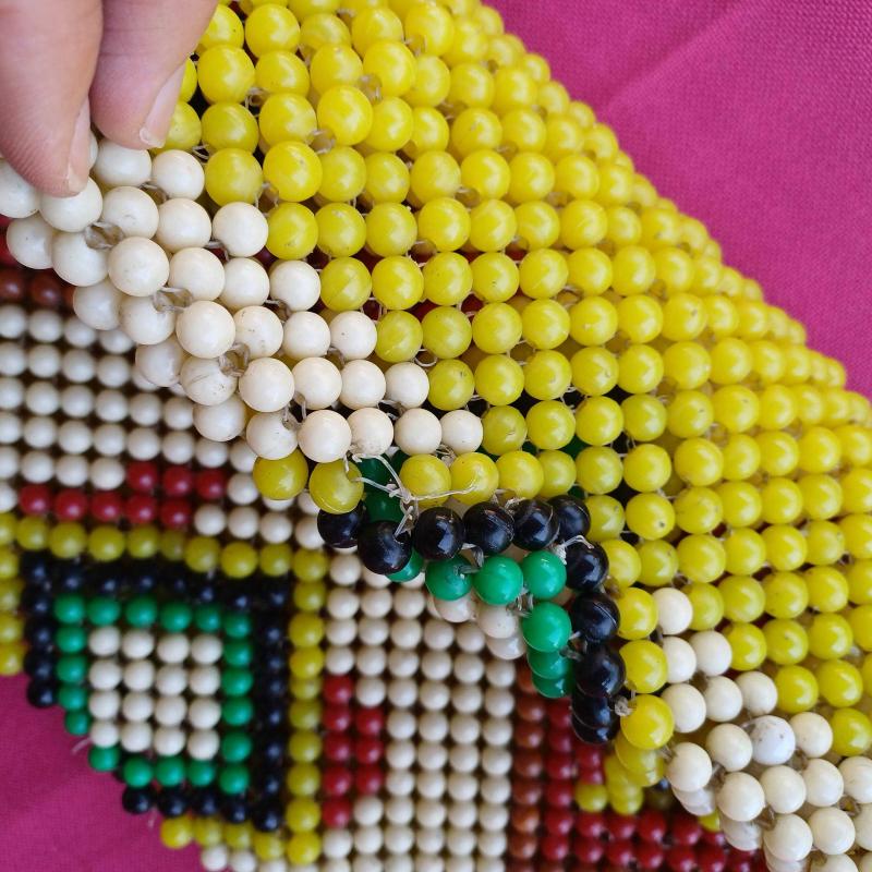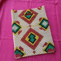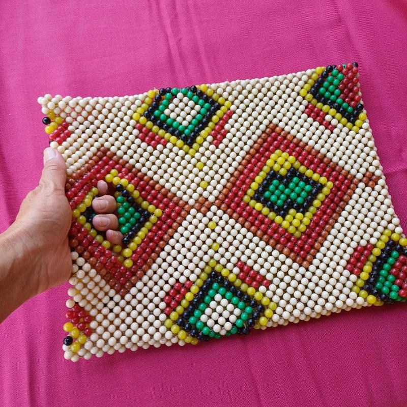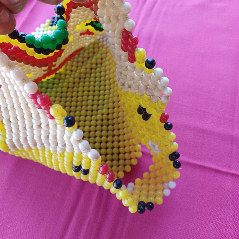 1940 lı yillardan, ortaögretim elişi dersinde üretilmis çanta.Plastik boncuklar, misina ile orulerek yapilmis,essiz bir koleksiyon. Ufak tefek kusurlari var amabutunlugunu etkileyecek bir problemi yok. Eski ve nadide bir elisi.