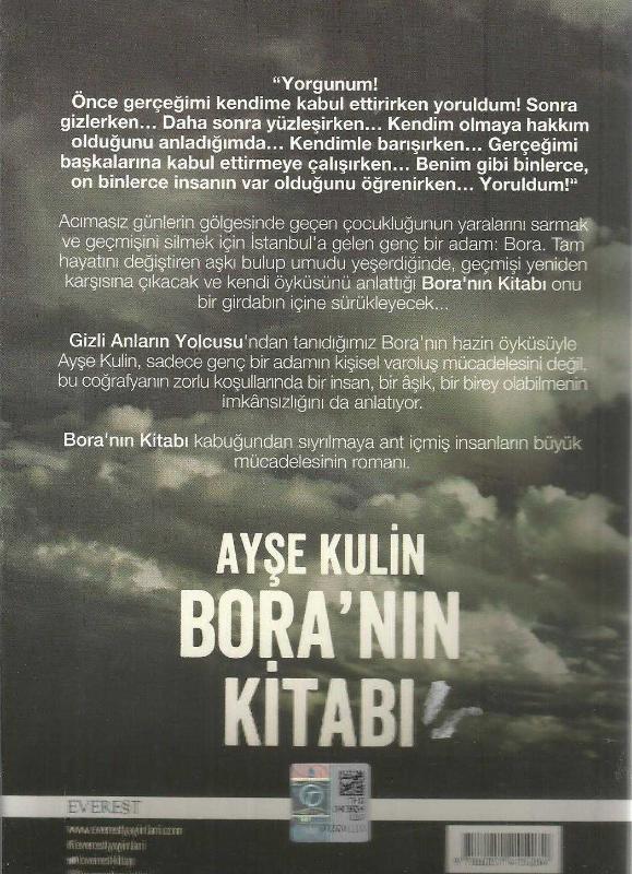 Bora’nın Kitabı, Ayşe Kulin tarafından kaleme alınmıştır. Kitap 2018 yılında Everest Yayınları tarafından [İstanbul] 9786051415284 ISBN kodu ile yayınlanmıştır. Satışta olan kitap, yayınevinin 9. baskısıdır. 250 sayfadır. Bora’nın Kitabı adlı eser Türkçe dilindedir.