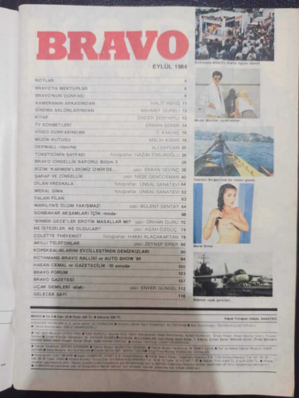 Kitap 1984 yılında yayınlanmıştır. 120 sayfadır. Bravo Dergisi- Eylül 1984- Sevtap Parman- Metin Erksan- Uğur Dündar- Marilyn Monroe- Jupp Derwall- Ali Saydam- Haydar Dümen- Erkan Sevinç- adlı eser Türkçe dilindedir.