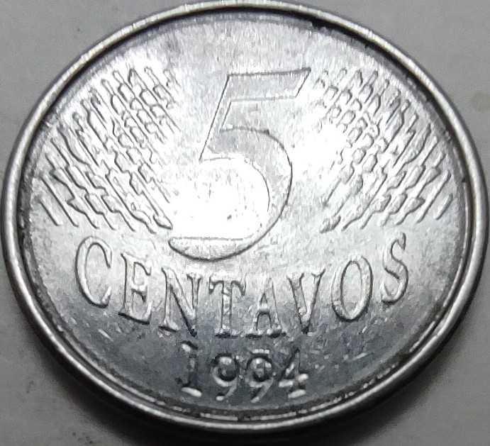 Brezilya'nın modern para birimi olan Real'e geçiş yaptığı ilk yıl olan 1994'e ait bu 5 Centavos, nümismatik açıdan tarihi bir geçiş sürecini temsil eder. Paslanmaz çelikten üretilen bu para, dayanıklılığı ve sade tasarımıyla bilinir. Ön yüzünde, Brezilya Cumhuriyeti'ni simgeleyen defne taçlı Cumhuriyet Büstü (Efígie da República) kabartması yer almaktadır. Arka yüzünde ise nominal değerin yanında Brezilya bayrağının ikonik bir parçası olan Güney Haçı Takımyıldızı (Cruzeiro do Sul) stilize edilmiştir. 1994-1997 yılları arasında kısa bir süre basılan bu ilk seri (Stainless Steel) sikkeler, Brezilya'nın hiperenflasyonla mücadelesinin ve ekonomik reformlarının birer nümismatik tanığıdır. Kondisyonu itibariyle çeliğin kendine has parlaklığını ve büst detaylarını korumaktadır.