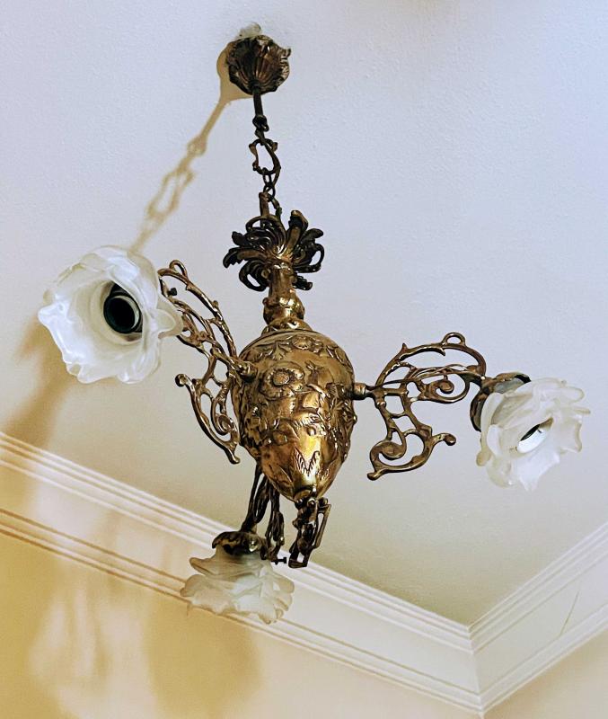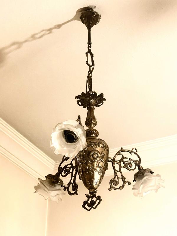 Ürün grubu: Antika ayna, avize, sehpa, bahü ve mobilyalar- Bronz 3 kollu gül fanuslu avize Ç:50 cm.