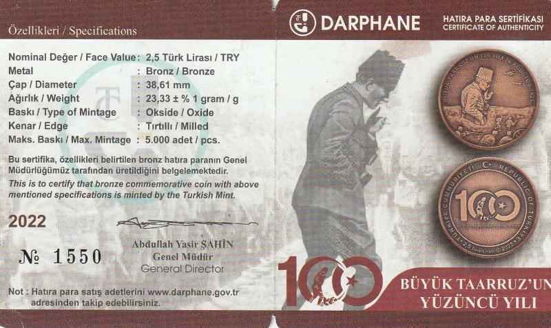 T.C Darphane Genel Müdürlüğü Büyük Taarruz'un 100'üncü Yılı Hatıra Parası Bronz Sertifika ve kendi kutusu ile gönderilecektir: NO: 1550
