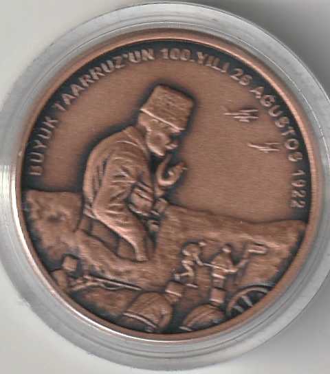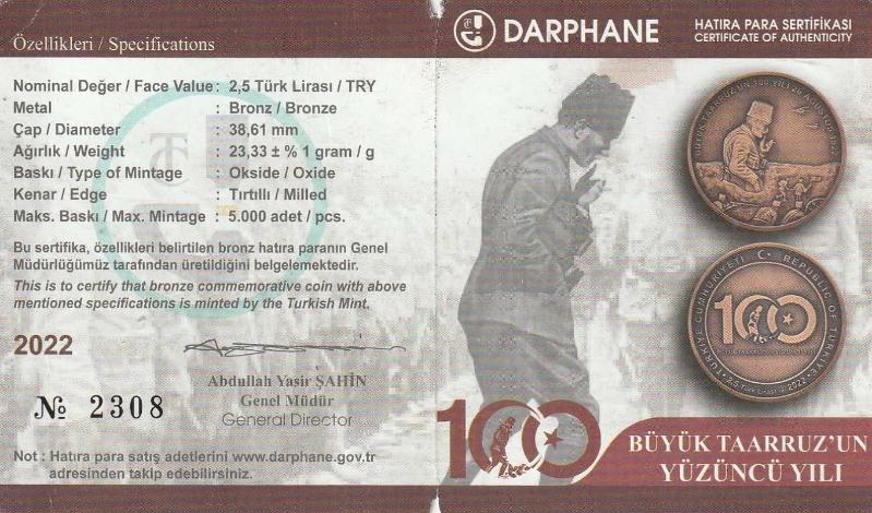 T.C Darphane Genel Müdürlüğü Büyük Taarruz'un 100'üncü Yılı Hatıra Parası Bronz Sertifika ve kendi kutusu ile gönderilecektir: NO: 2308
