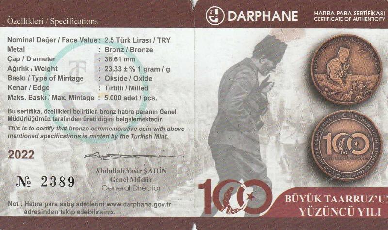 T.C Darphane Genel Müdürlüğü Büyük Taarruz'un 100'üncü Yılı Hatıra Parası Bronz Sertifika ve kendi kutusu ile gönderilecektir: NO: 2389