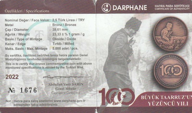 T.C Darphane Genel Müdürlüğü Büyük Taarruz'un 100'üncü Yılı Hatıra Parası Bronz Sertifika ve kendi kutusu ile gönderilecektir: NO: 1676