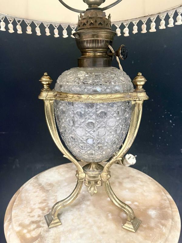3 ayaklı bronz kaide üzerine monte edilmiş kristal gövdeli, şapkalı, gaz lambası. monapka aparatlı masa lambası. 19 Y.y. Duy monte edilerek elektrikli lambadere dönüştürülmüş. Kondisyonu mükemmel. Hiçbir kırık veya çatlağı yoktur. Şapka dahil Y:65 cm.