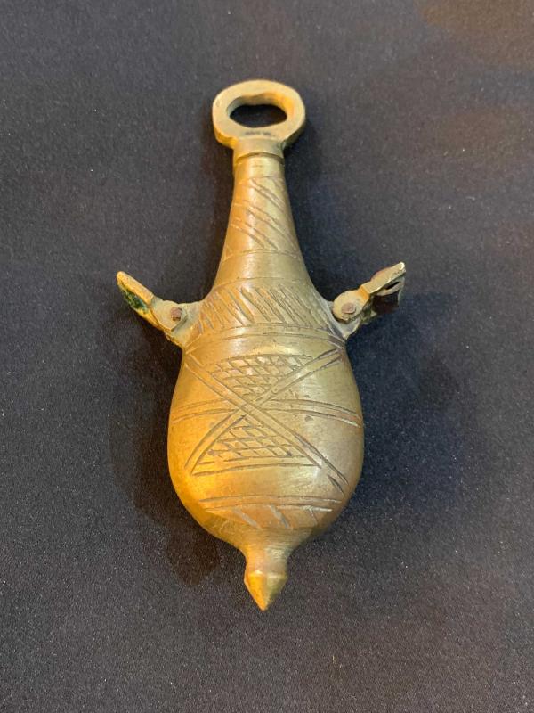 Bronz malzemeden yapılmış koleksiyonluk eski barutluk. 11 cm yüksekliğindedir