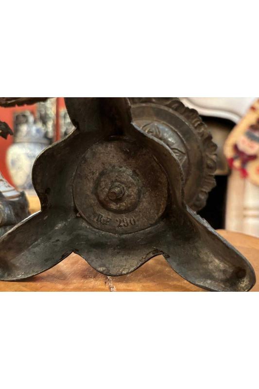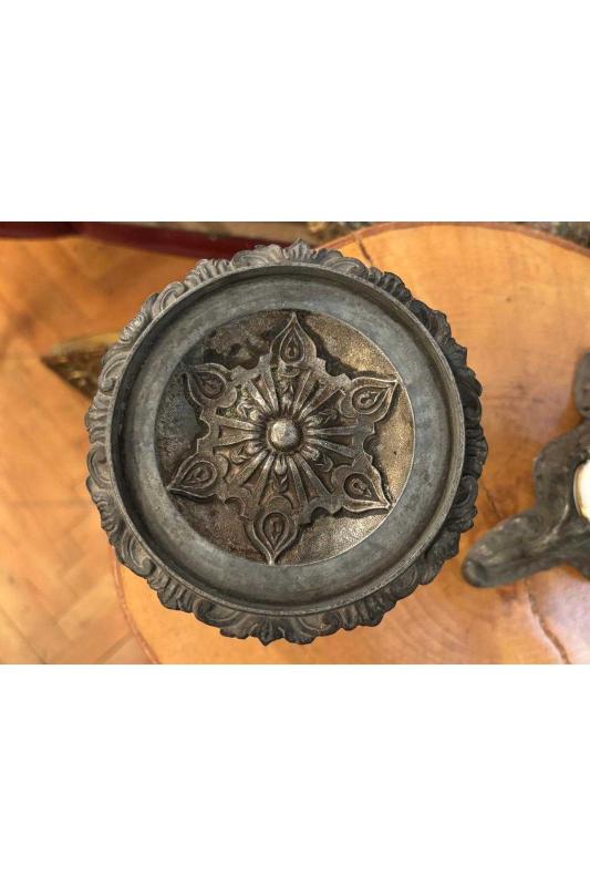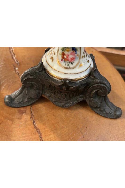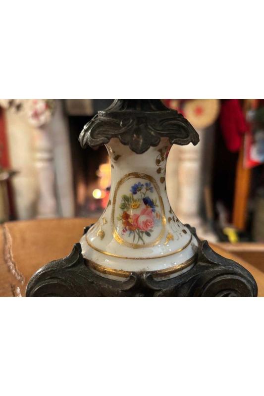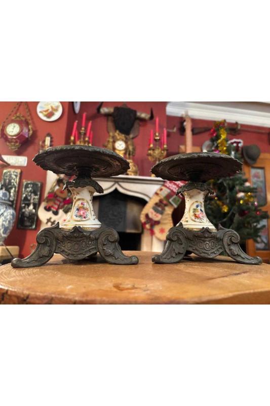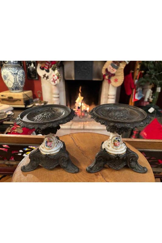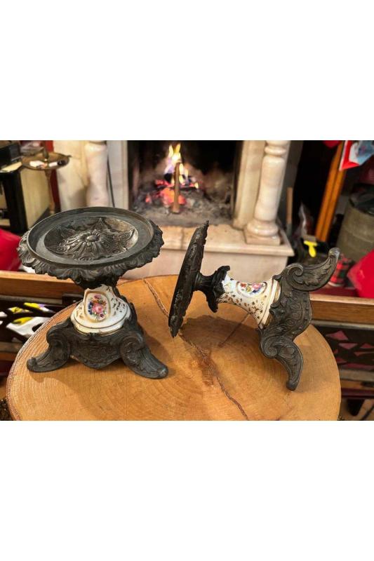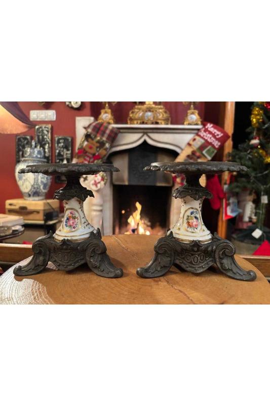 Bronz ve porselen‘den Fransız bir çift şamdan 14 cm boyunda 13 cm çapında başlıklı antika/koleksiyon objesinin menşei belirtilmemiştir. Objenin ait olduğu dönem bilinmeketedir.