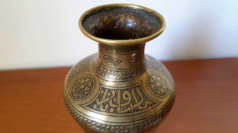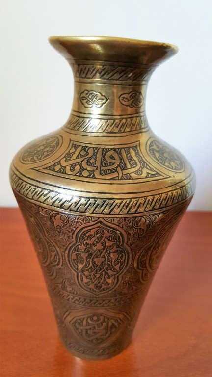Bronz yüzeyi el kakmalı İslamik antika vazo. 19. Y.y. Y.17cm başlıklı antika/koleksiyon objesinin menşei belirtilmemiştir. 1800-1849 arası dönemine aittir.